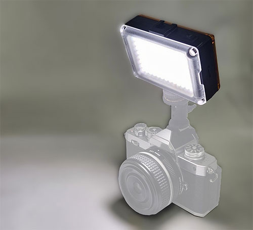 前モデル同様、104個のLEDからなる持ち運びに便利な、小型LEDライトです。無段階光量調節が可能ですので、撮影時、瞬時に光量の微調整が可能です。前後の樹脂カバー(ホワイト/オレンジ)は拡散板になっていますので、 状況に応じて、交換し撮影をサポートします。電源は単三電池4本又は、タイプCポートからになります。単三電池4本あればいつでもどこでもご使用になれますので、大変便利です。ライト本体にはデュアルコールドシュースロットよりマイク等のアクセサリーを取付ける事が可能です。
